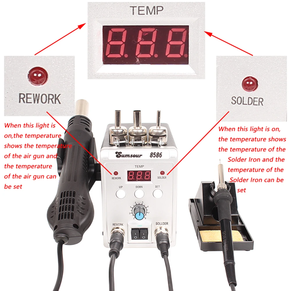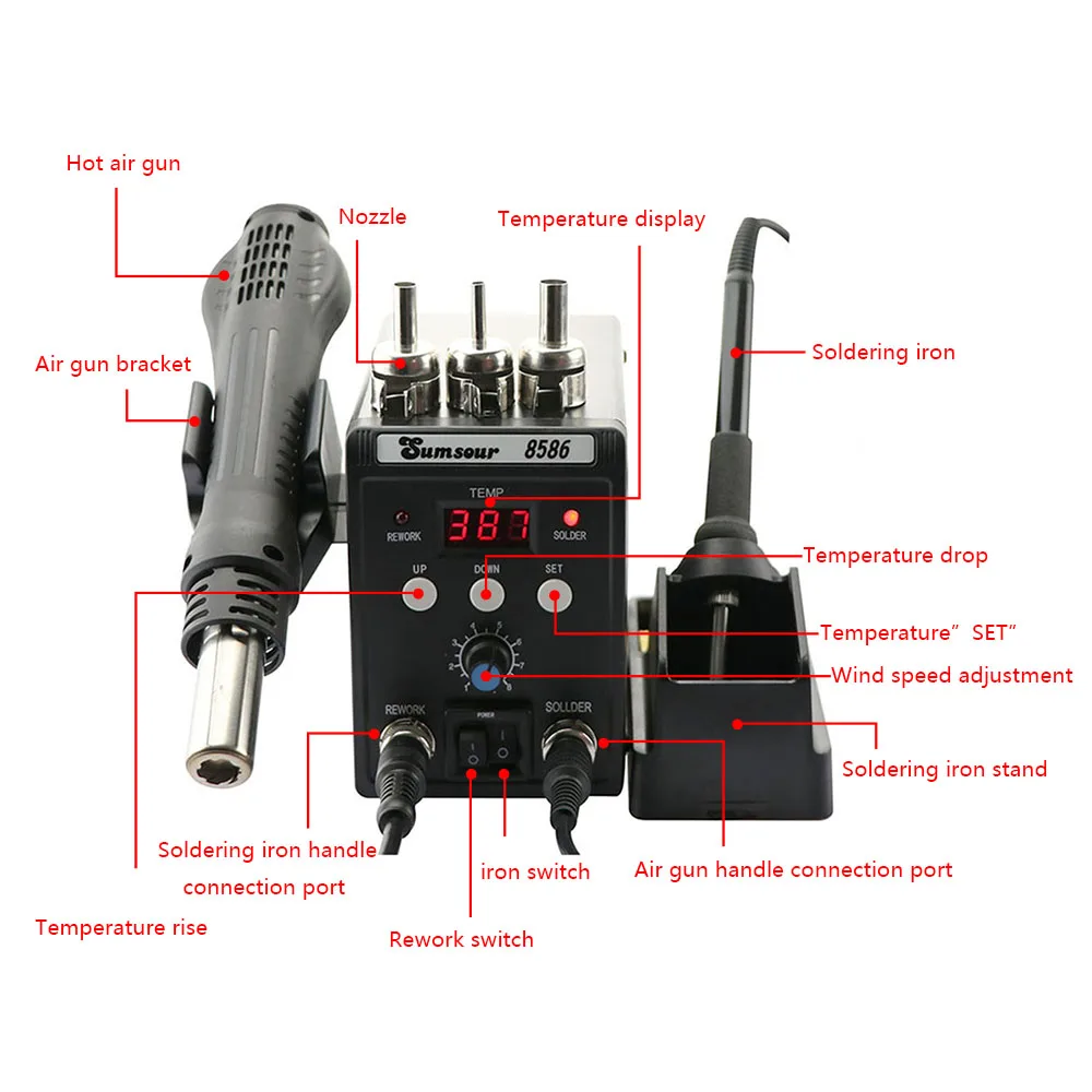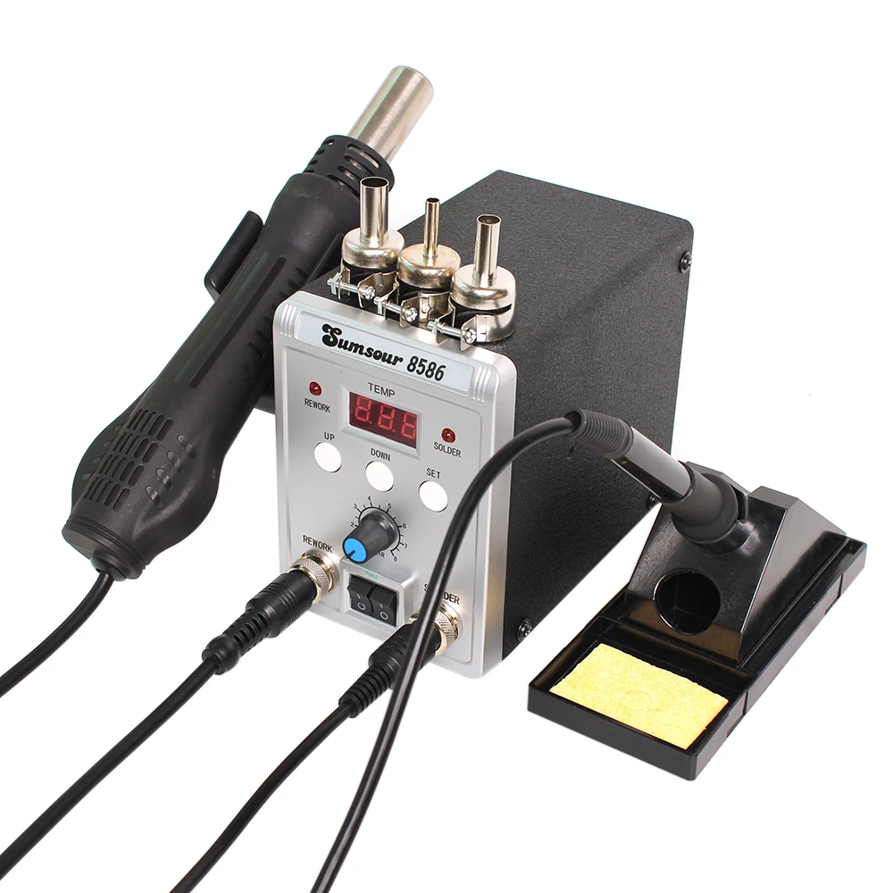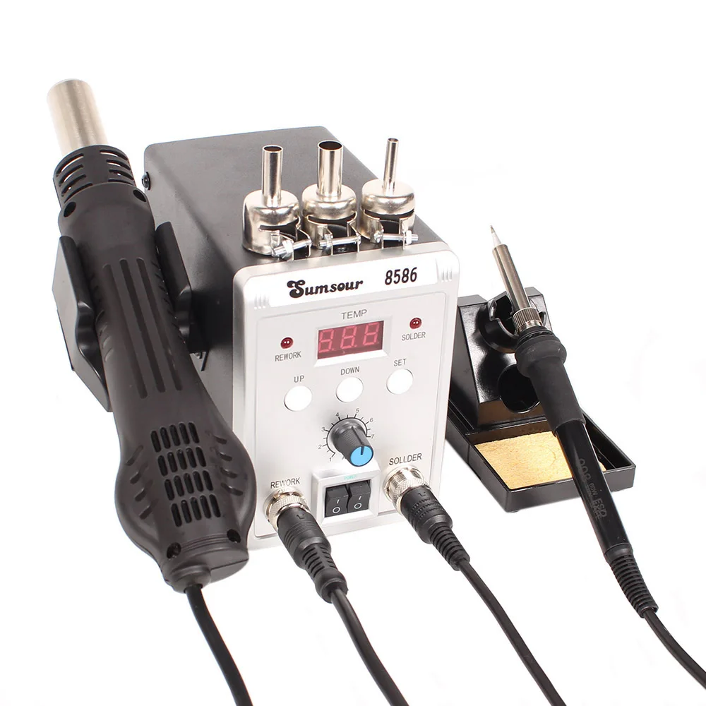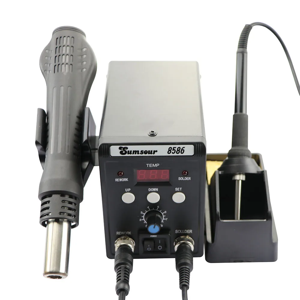 This is a brand new 2 in 1 SMD Rework Soldering Station 8586. Alloy metal body with highquality silicone shell features elegant appearance and power saving. You can use hot air gun and soldering iron separately, with no interference with each other.